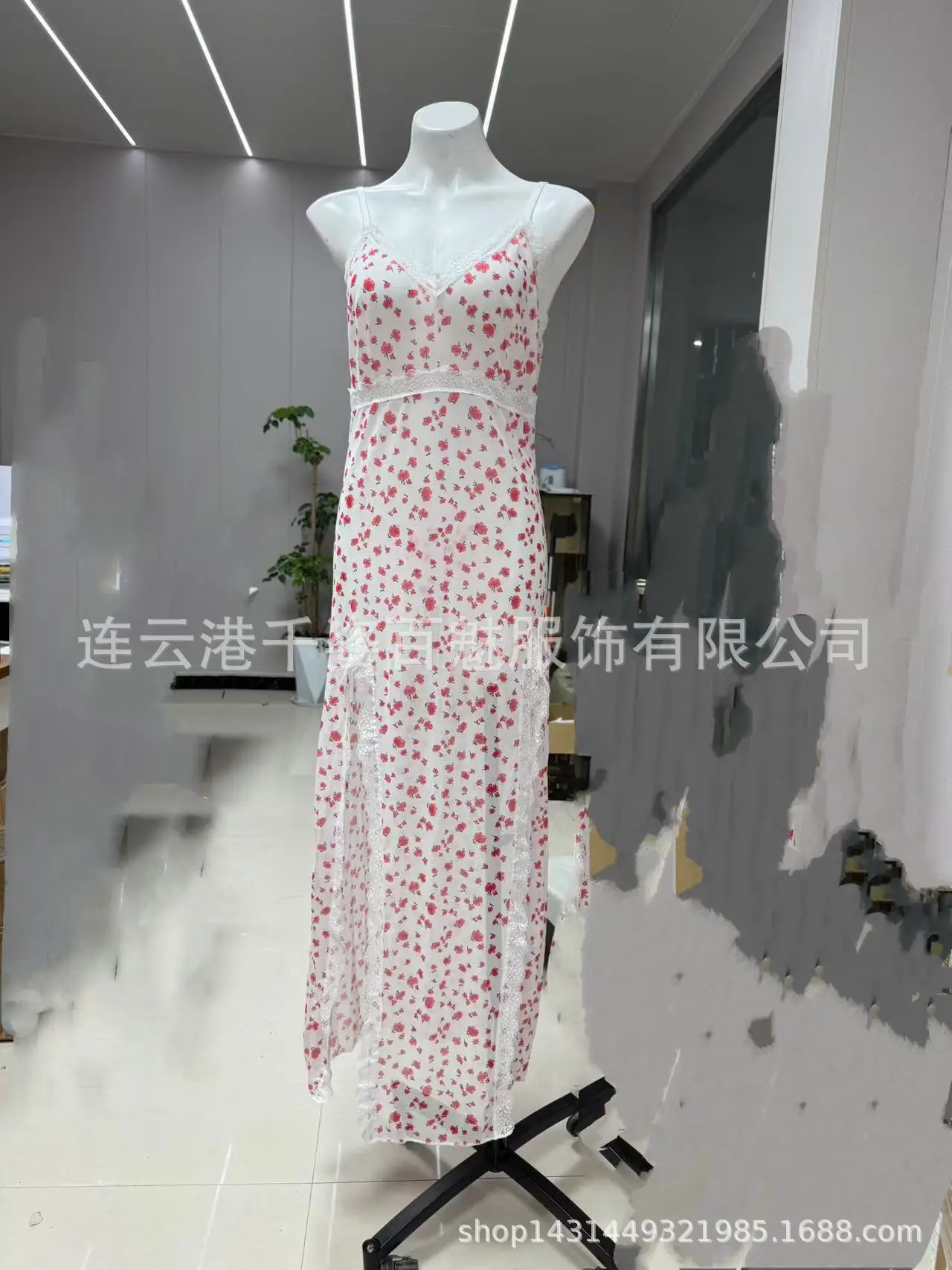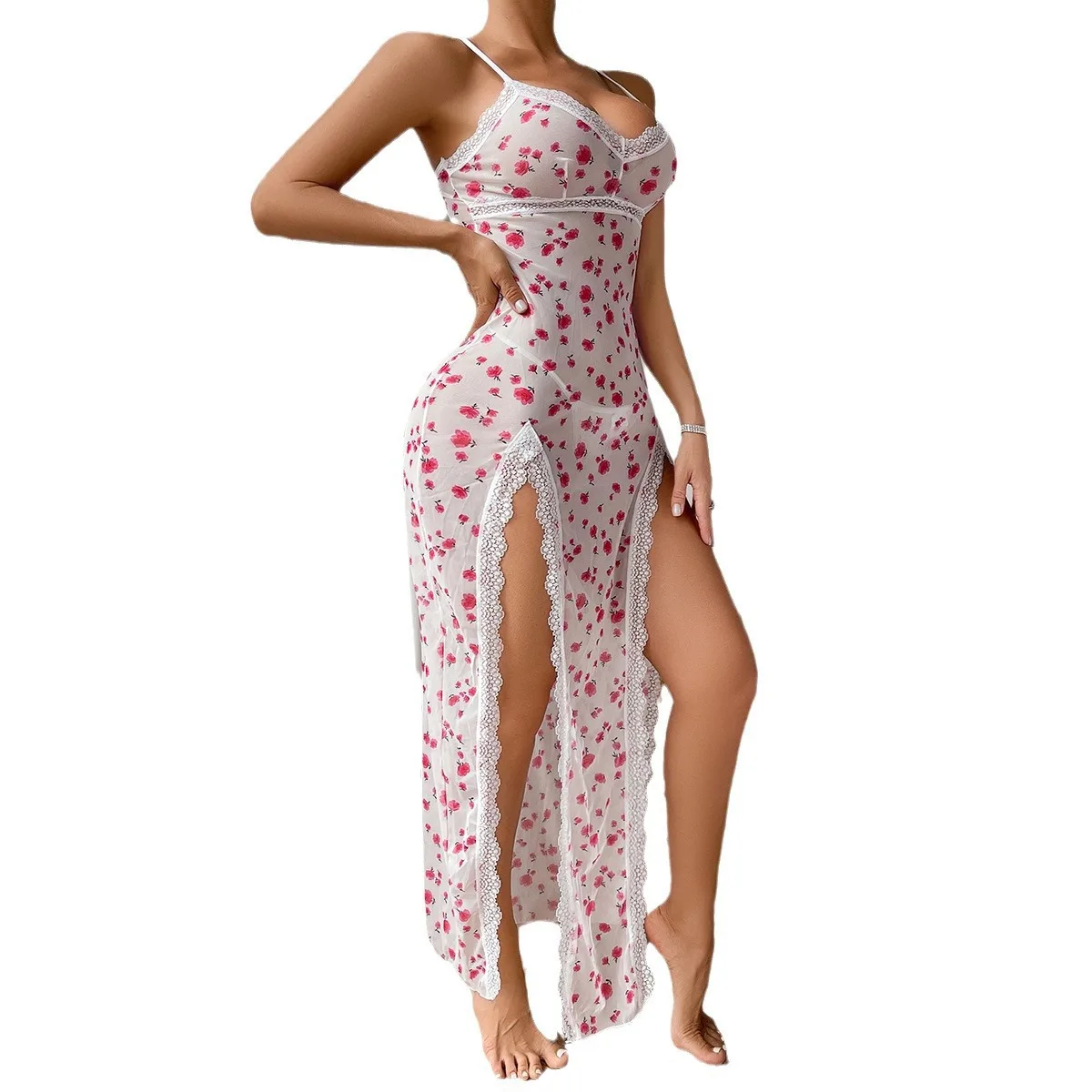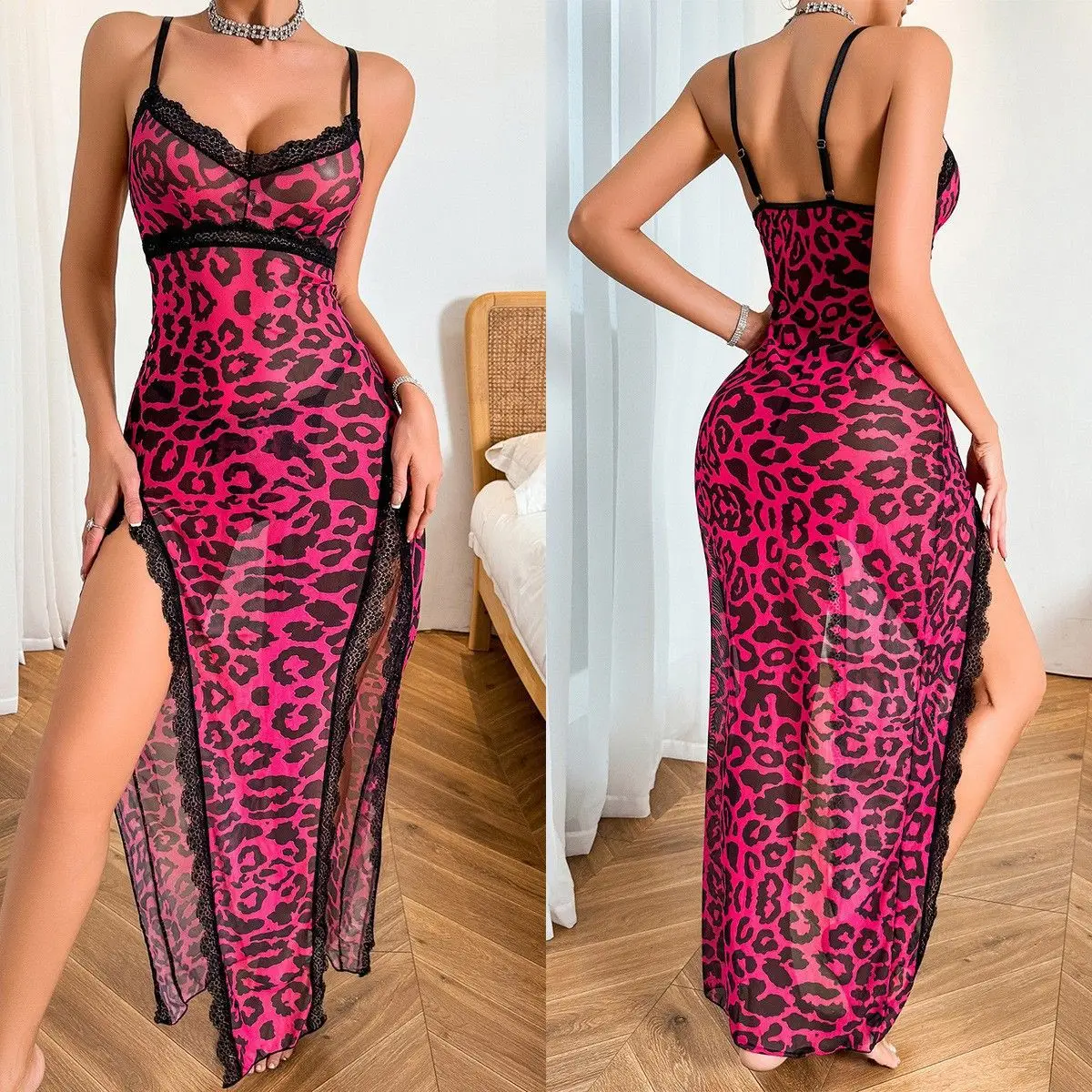 2025 Women’s Summer Sexy Leopard Print Nightgown Satin V-Neck Lace Trim Dress Hight Side Slit Contrast Lace Nightgown for Women
